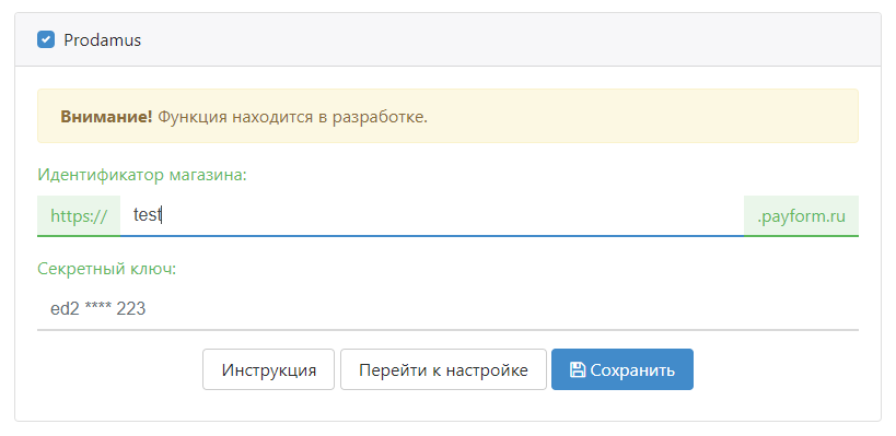 Внимание! После завершения тестирования переведите Prodamus в Режим приема оплаты.