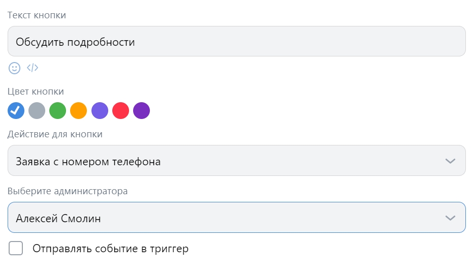 В настройках кнопки в блоке с кнопкой и с обложкой одним из действий может быть выбрана Заявка с номером телефона. В этом случае у пользователя будет запрошено разрешение на получение телефона, и этот номер будет отправлен выбранному администратору.