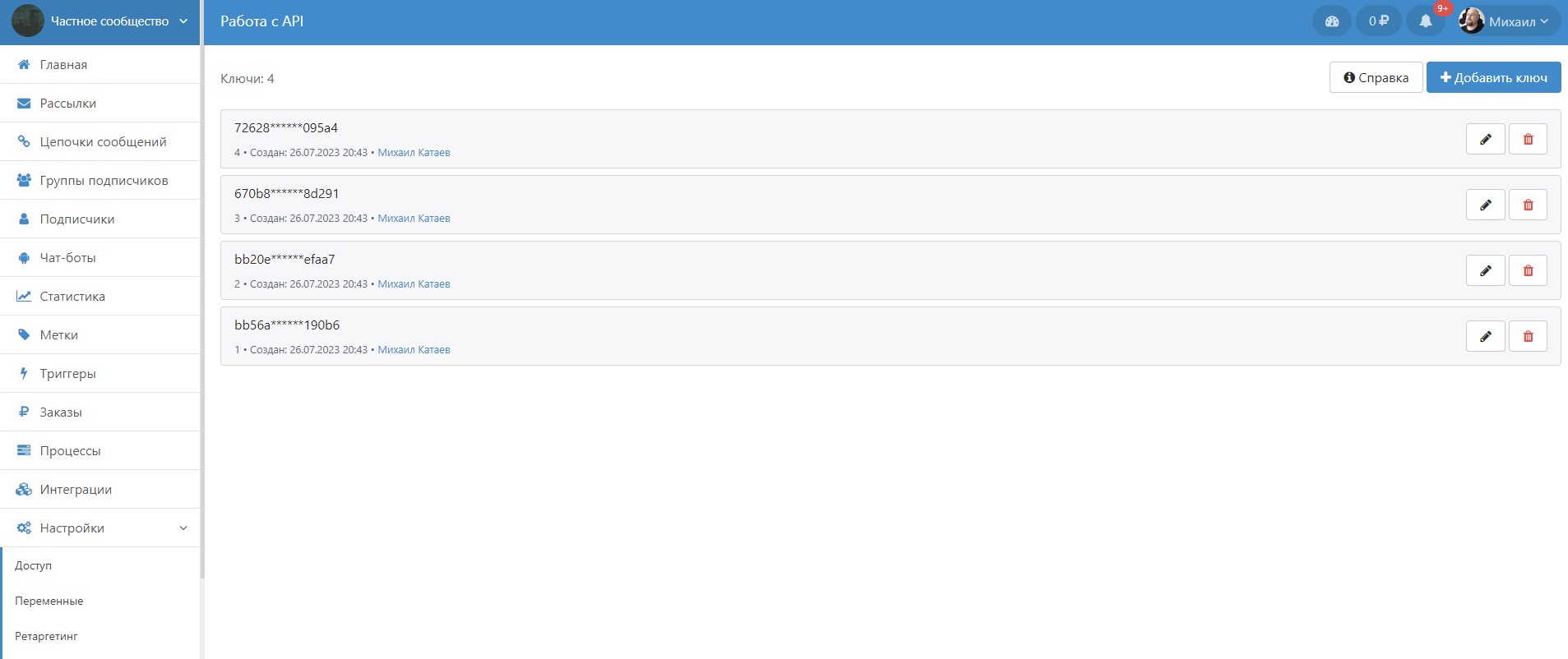 Создать ключ доступа можно в разделе Настройки - Работа с API. Можно создать до 20 ключей для интеграции с другими сервисами.