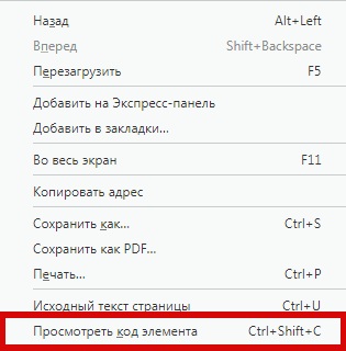 В открывшемся меню выберите пункт «Просмотреть код» («Просмотреть код элемента» или «Исследовать элемент» в зависимости от браузера).