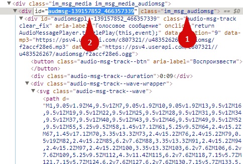 Найдите тег div с классом im_msg_audiomsg (с помощью сочетания Ctrl+F) и скопируйте значение его идентификатора (без кавычек).