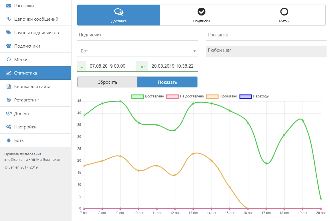 В разделе Статистика собираются все данные по подпискам, отправленным сообщениям и меткам, которые можно фильтровать и находить необходимую информацию.
