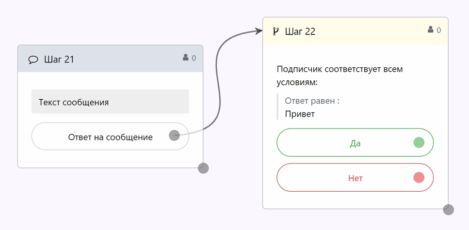 Внимание! Условные блоки не ожидают никаких действий. Например, если указать условие Прочитанность какого-нибудь сообщений в боте, то условный блок не будет ждать, пока пользователь прочитает, а сразу пойдет по ветке - Нет.