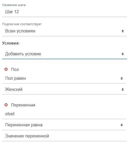 Условные блоки позволяют выполнить проверку одного или нескольких условий и в зависимости от результата вести подписчика по одной из веток.