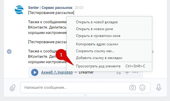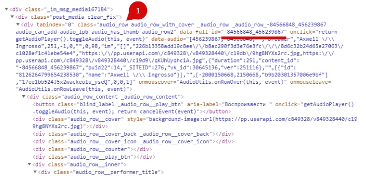 Наводим курсор на нужную аудиозапись и щелкаем правой кнопкой мыши. В открывшемся меню выберите пункт «Просмотреть код» («Просмотреть код элемента» или «Исследовать элемент» в зависимости от браузера).