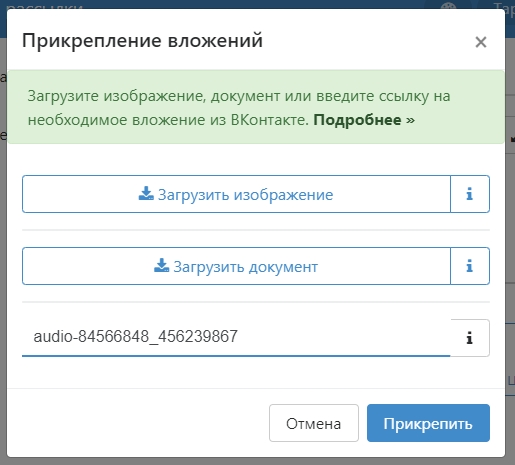 При создании рассылки выбираем «Прикрепить» под сообщением, пишем audio и вставляем скопированный идентификатор без пробела, чтобы получилась строка вида audioXXXXXX_XXXXXX