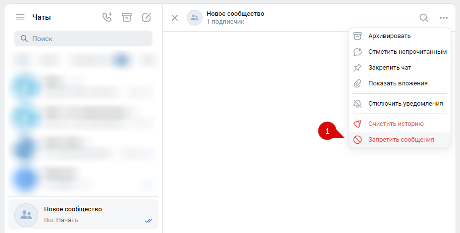 Самый просто и удобный способ, чтобы отписаться от рассылок ВКонтакте, это открыть диалог, в котором приходят нежелательные сообщения, нажать на кнопку с многоточием и в меню выбрать пункт **«Запретить сообщения»**.