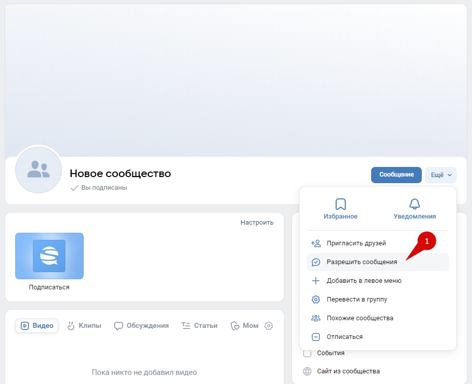 Чтобы разрешить сообщения от сообщества ВКонтакте, необходимо перейти на страницу сообщества и в меню «Еще» выбрать пункт «Разрешить сообщения».