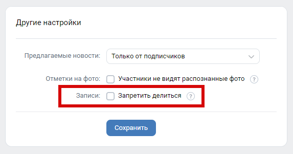 Для этого необходимо в Управлении сообществом ВКонтакте перейти в раздел Настройки и выключить опцию **Запретить делиться**.