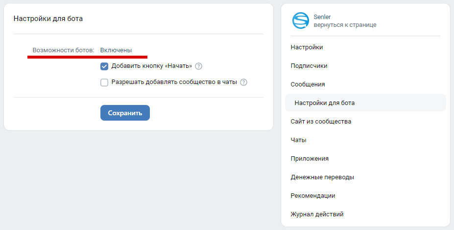 Данная ошибка возникает, когда в настройках сообщества ВКонтакте выключены **«Возможности ботов»**.
