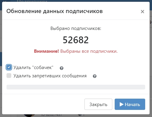 Аккаунты, которые были удалены или заблокированы, называют "собачками". ВКонтакте никак не уведомляет об удалении аккаунтов. Исключить из базы такие аккаунты можно с помощью функции Обновления данных подписчиков и включением соответствующей опции.
