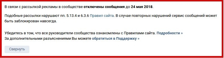 Нарушение этих правил приводит к отключению сообщений в сообществе, а в случае повторного нарушения - к блокировке сообщества.