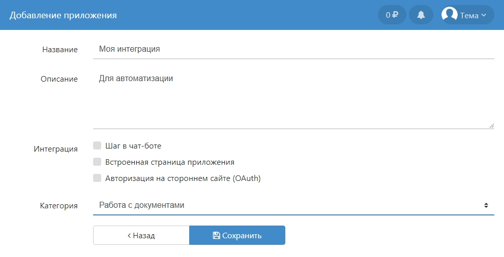 Выберите категорию - этот параметр также будет использоваться в каталоге, если вы укажете тип приложения "Публичное"
