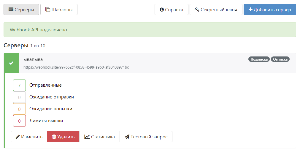 На вкладке Серверы отображается перечень адресов, на которые отправляются запросы при наступлении событий, таких как оформление или отмена подписки.