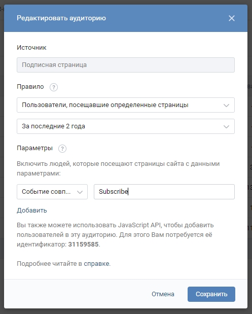 Пиксель ВКонтакте позволяет собирать подписчиков в аудитории ретаргетинга в рекламном кабинете ВКонтакте. Затем эти аудитории можно использовать в рекламных кампаниях.