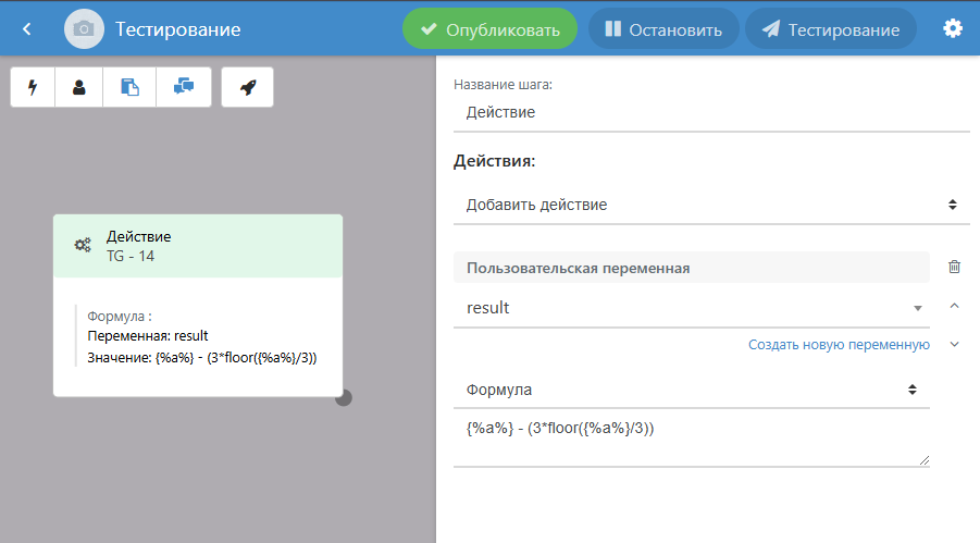 В переменные можно сохранять результат математической функции. Функции для работы с переменными используются в блоке **Действие -> Переменная -> Формула**: