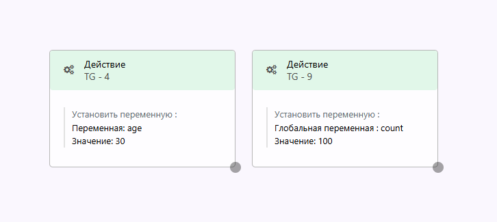 Переменные позволяют сохранять необходимые в них данные. Они могут быть как пользовательскими, когда сохраняются конкретные данные для конкретных пользователей, и глобальными, когда одно значение равноценно для всех участников бота.