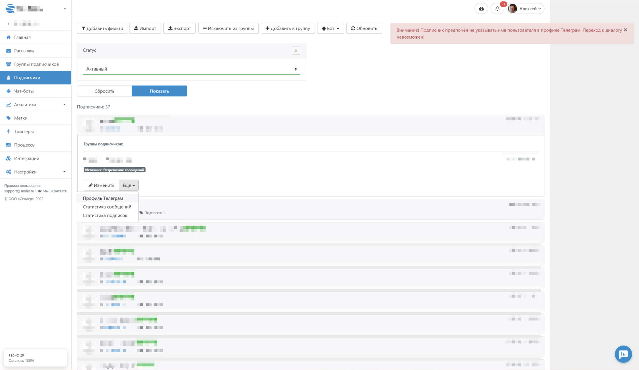 В сервисе существует возможность перейти в профиль подписчика в Телеграм. Для этого нужно нажать на подписчика, кнопка **Еще - Профиль Телеграм:**