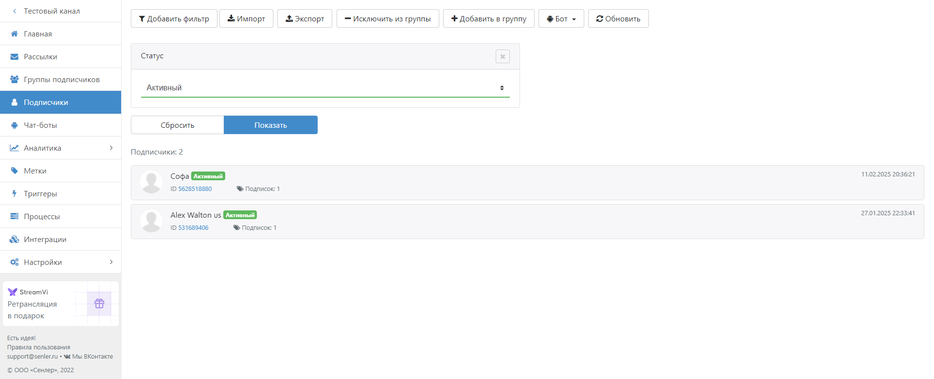 В рамках сервиса под **"подписчиком"** понимается пользователь, который запустил бота в Telegram.