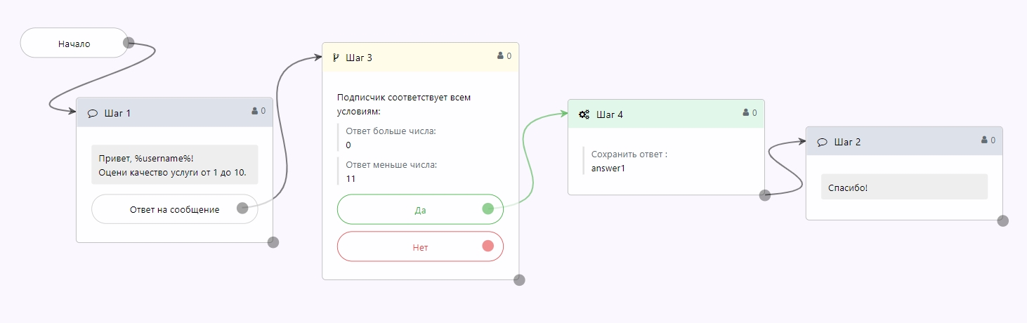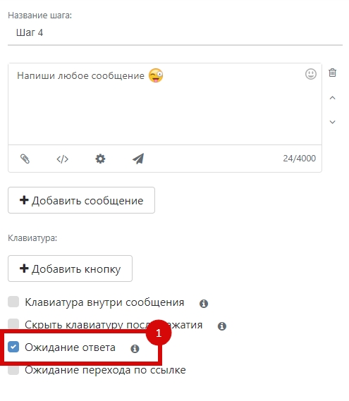 Для того, чтобы чат-бот мог реагировать на ответы пользователей, в шаге с сообщениями необходимо устанавливать опцию Ожидание ответа.