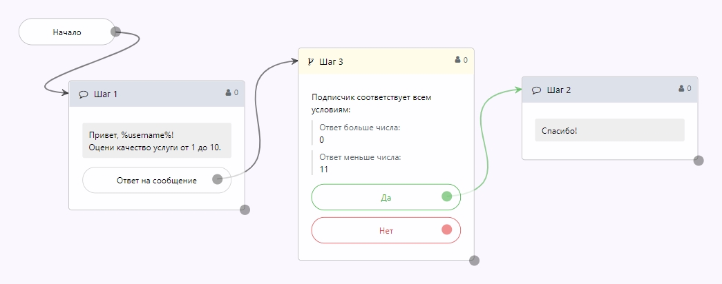Ответ пользователя можно проверить с помощью шагов с условиями Ответ на сообщение.