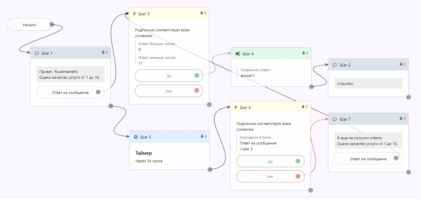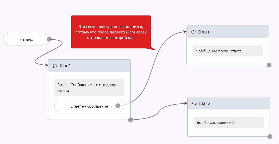 Все шаги после Ответа на сообщение будут выполняться только после того, как пользователь сам напишет какое-нибудь сообщение.