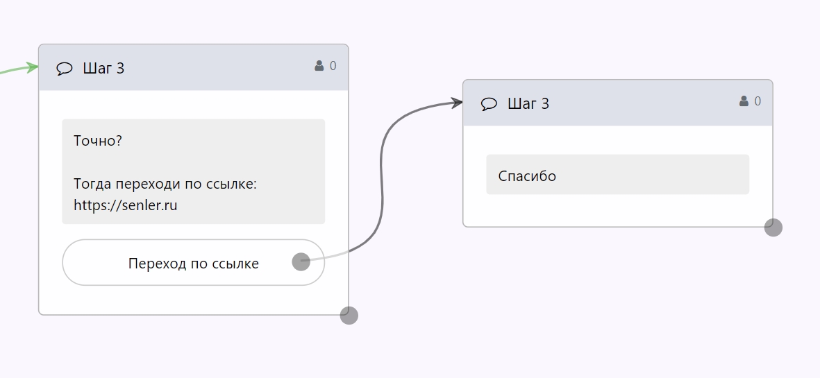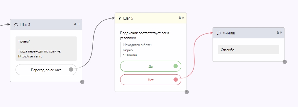 Чтобы шаг после перехода по ссылке не срабатывал каждый раз, необходимо добавить условие: Состоит ли пользователь на следующем шаге.