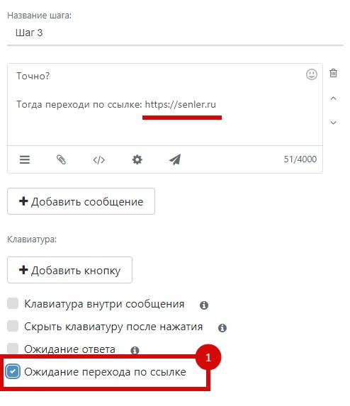 Для того чтобы собиралась статистика переходов по ссылкам, и чат-бот мог реагировать на переходы по ссылкам, в шаге с сообщениями необходимо включить опцию «Ожидание перехода по ссылке».