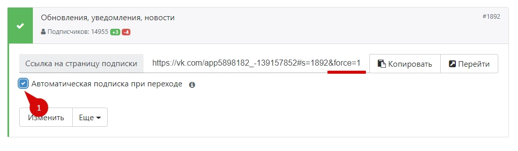 в ссылке на подписную страницу. Она не сохраняется, и чтобы снова после обновления страницы взять ссылки с эффектом «автоподписки», необходимо снова включить галочку и скопировать ссылку.