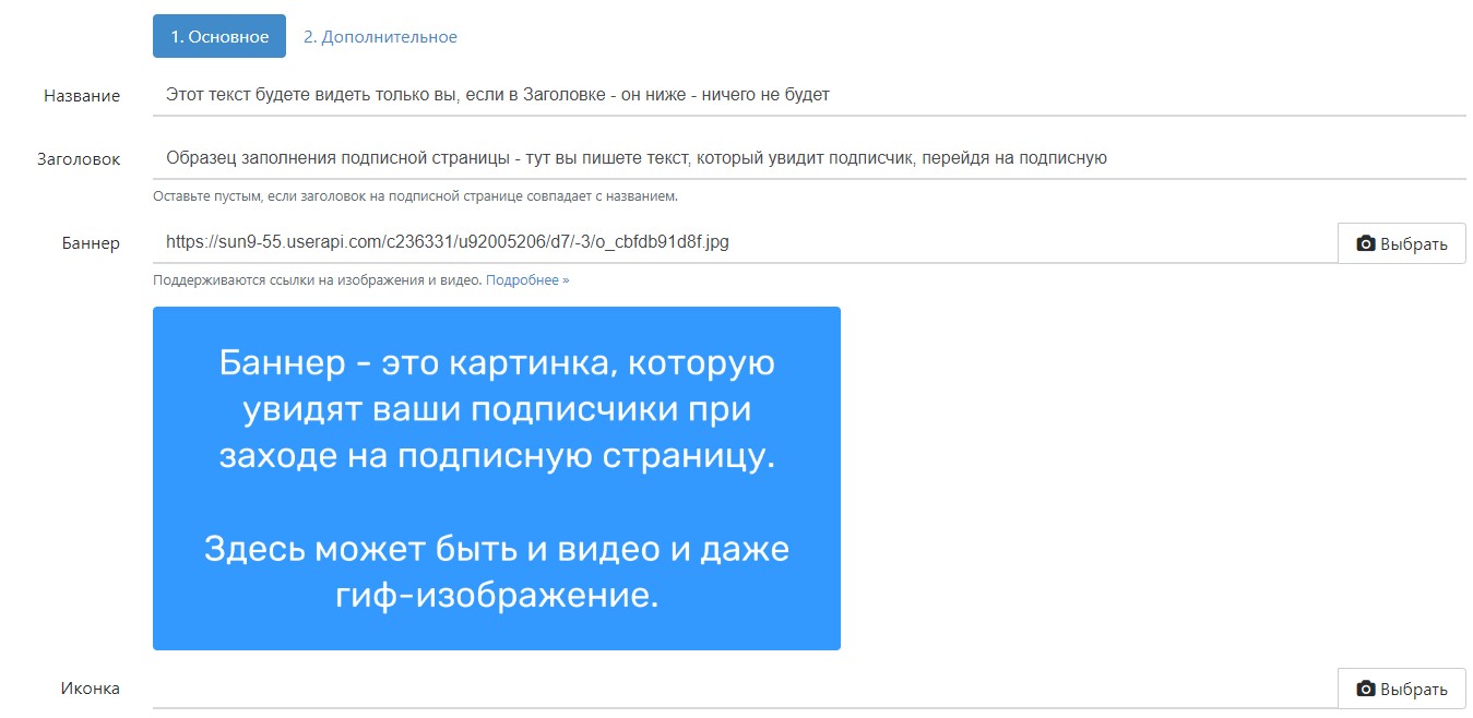 Далее у вас откроются поля заполнения подписной страницы - "обложки" вашей группы подписчиков: