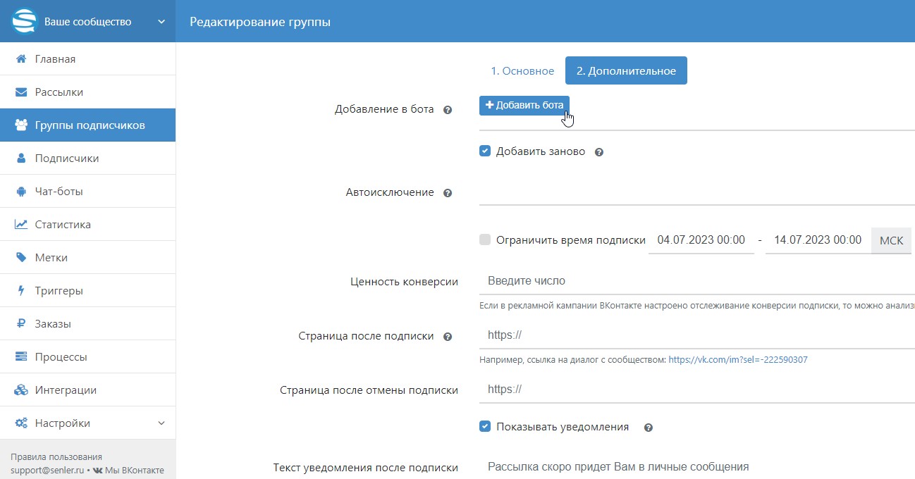 Если вам необходимо, чтобы после подписки человек сразу попадал в чат-бота и ему приходило сообщение от чат-бота - то вот тут - на вкладке "Дополнительно" - нужно добавить того чат-бота, который создан вами для рассылки сообщений при подписке: