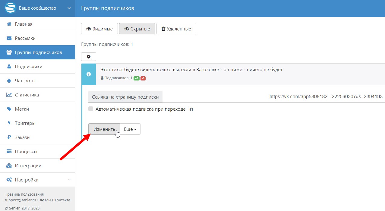 При необходимости вы всегда можете отредактировать готовую подписную страницу группы подписчиков в вашем личном кабинете Senler: