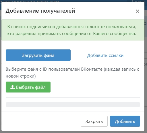 Это рассылка по загруженному списку получателей в определенное время. Загрузить список можно файлом с идентификаторами пользователей в каждой строке либо вставить список идентификаторов в текстовое поле.