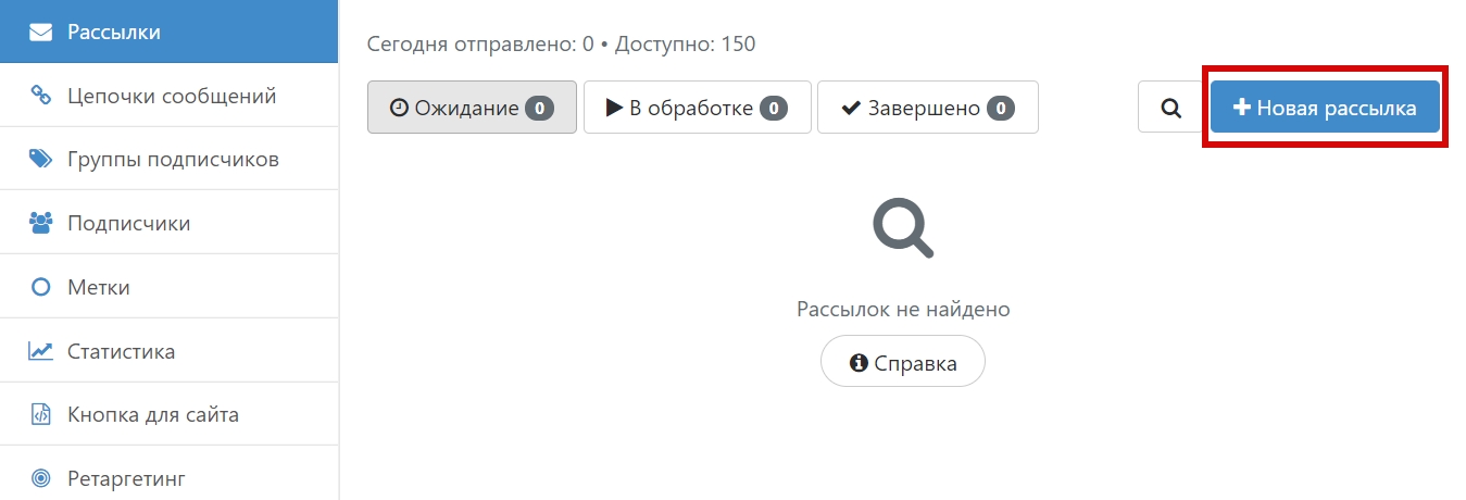 Чтобы создать рассылку перейдите в раздел Рассылки и нажмите на кнопку Новая рассылка.