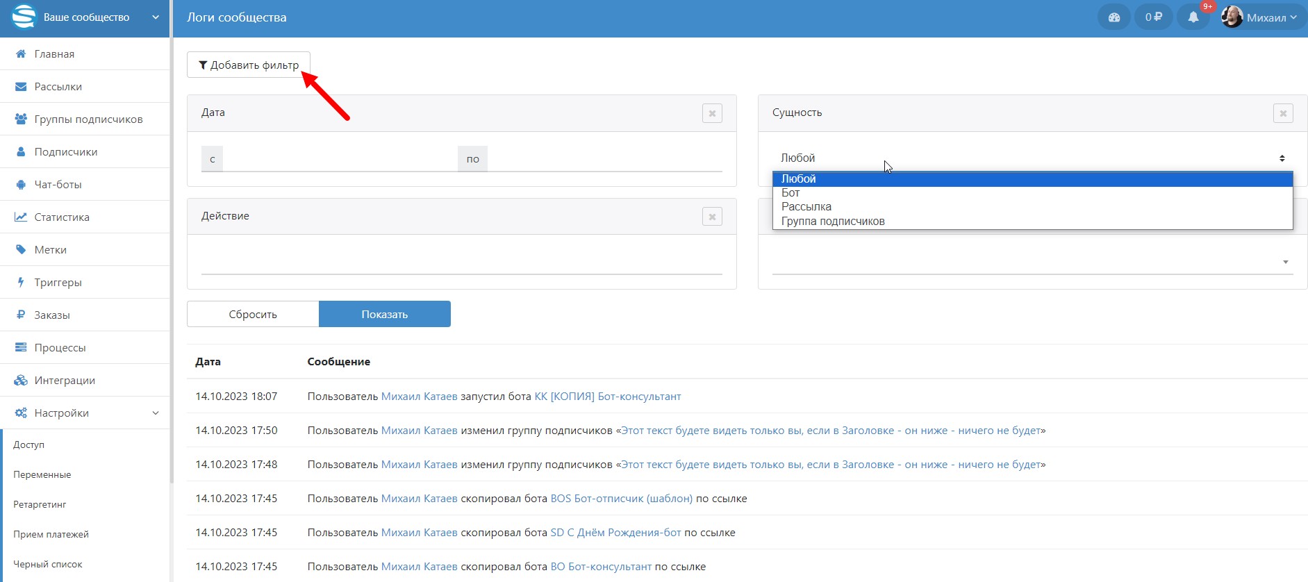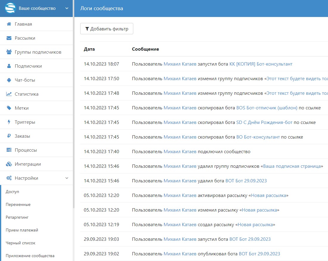 Данная опция позволяет увидеть, какие действия с ботами и рассылками совершал сотрудник сообщества на аккаунте сообщества в Senler.