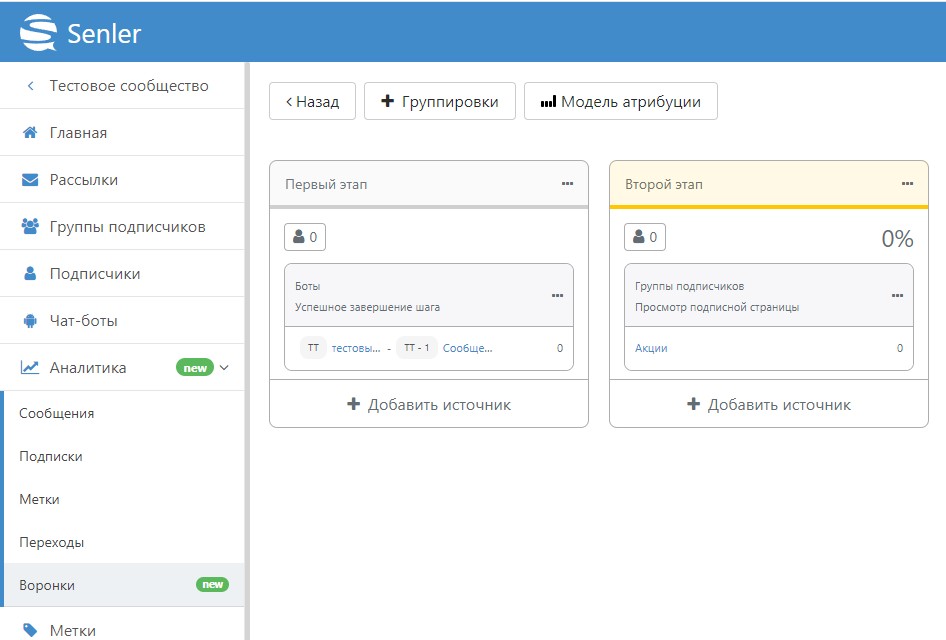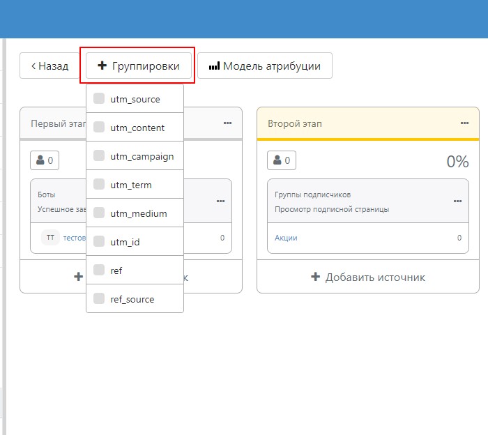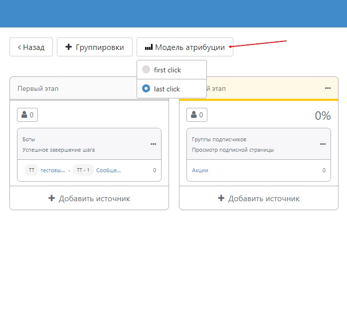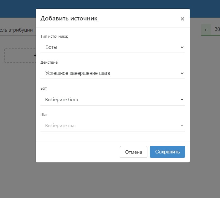 В источниках выберите тип источника - это может быть группа подписчиков, чат-бот или рекламный кабинет (в данный момент поддерживается старая версия рекламного кабинета)