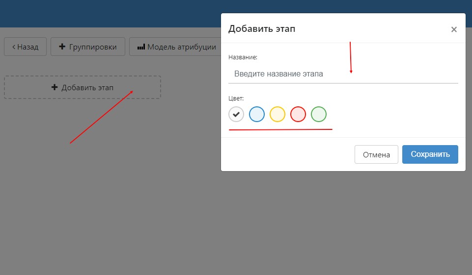 Воронка состоит из этапов. Каждый этап вы создаёте сами, присваивая ему название, цвет, и главное - источник: