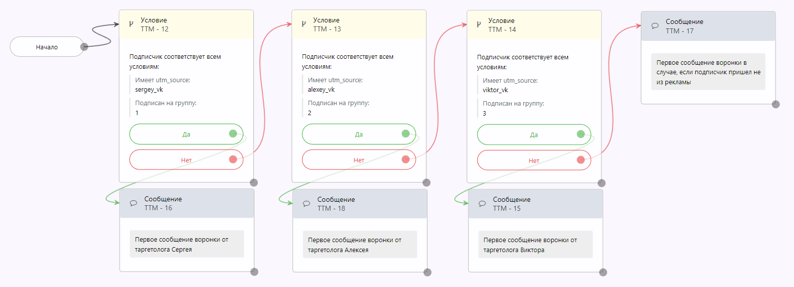 Вот так выглядела бы схема выше, если не использовать блок "группа условий":