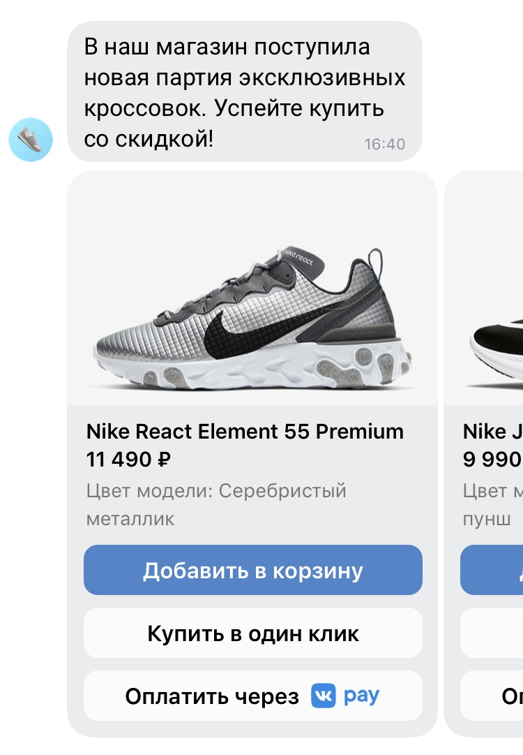 **Карусель** — это шаблон сообщения, который содержит несколько элементов, элементы карусели можно скролить горизонтально.