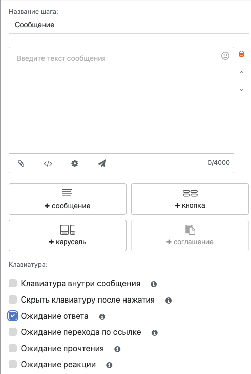 Для того, чтобы чат-бот мог реагировать на ответы пользователей, в шаге с сообщениями необходимо устанавливать опцию **Ожидание ответа**.&#x20;