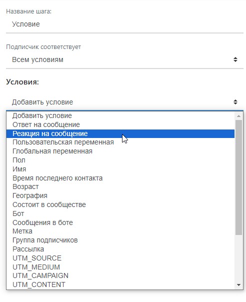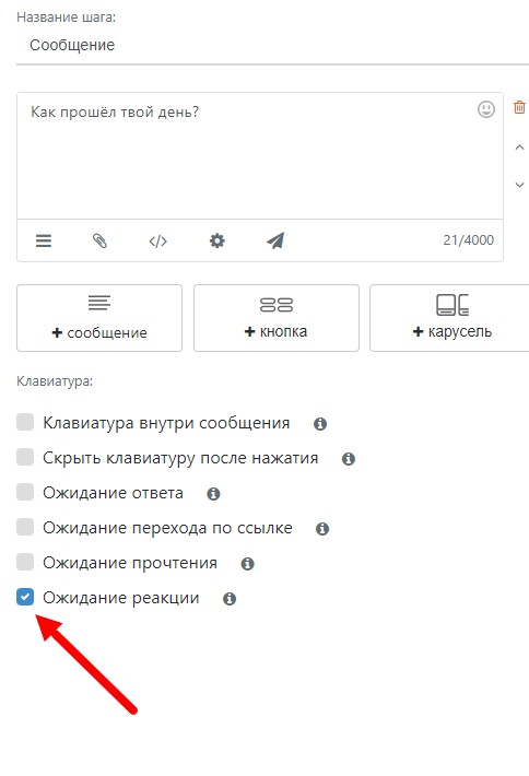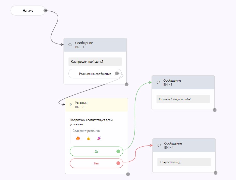 Данная опция позволяет прописать дальнейшее движение человека по боту на основе реакции, которую он оставил на сообщение от бота.