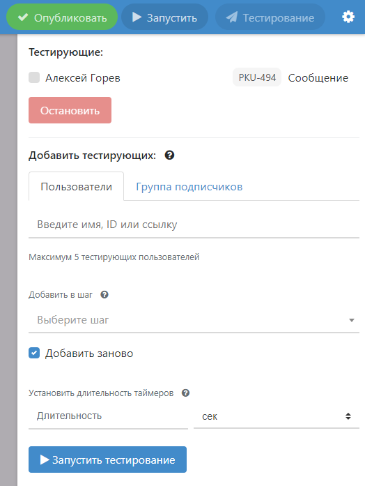 **Тестирующие** - это те люди, кто на данный момент проходит чат-бота. Напротив них указан шаг, на котором они находятся. Также в любой момент можно остановить тестирование, поставив галочку рядом с именем и нажав на кнопку **Остановить**.