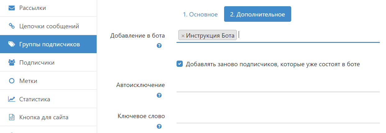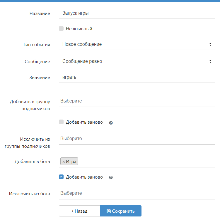 Опция Добавить заново позволяет пользователю, который уже начал проходить бота, после отписки и повторной подписки запускать бота с самого начала. Если нужно, чтобы пользователи не смогли повторно проходить бота, то отключите эту опцию.