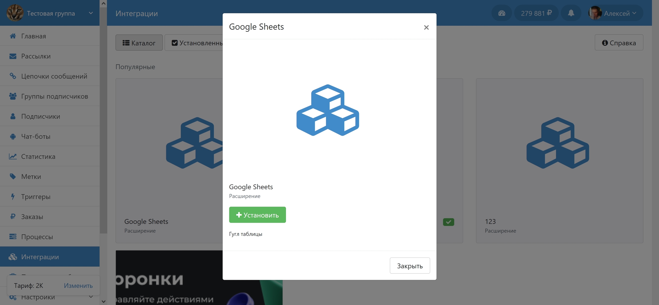 Для того, чтобы установить интеграцию необходимо выбрать нужный вам сервис и нажать на кнопку «Установить».