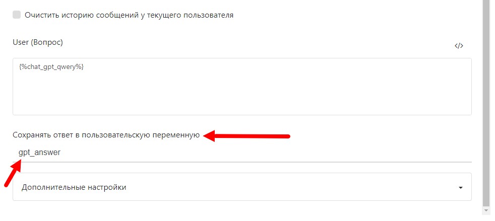 В поле Сохранить ответ в пользовательскую переменную укажите переменную, куда будет записываться результат (например,