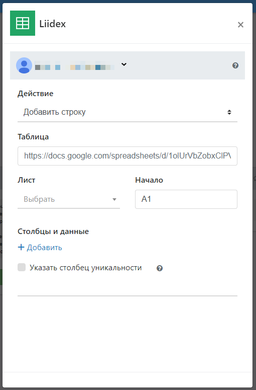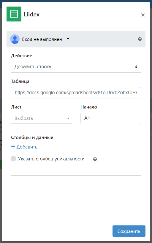 Указать столбец уникальности - при включении этой опции, сначала происходит поиск по этому столбцу: если найдена строка с аналогичным значением, то остальные значения в найденной строке обновляются на новые. Если совпадений нет, то добавляется новая строка.