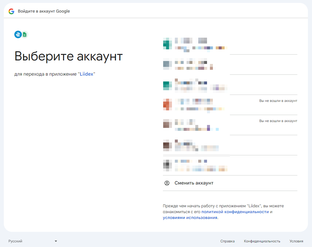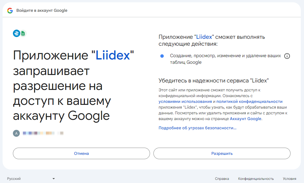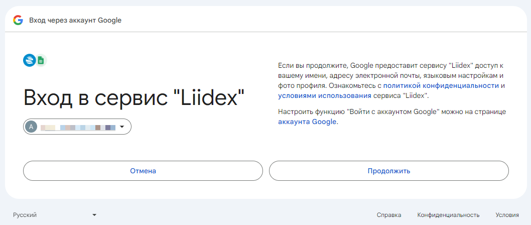 Затем предоставляете доступ нашему приложению Liidex к вашему аккаунту Google (не переживайте, интеграция не получит полный доступ к вашему аккаунту, а лишь возьмет перечисленные на скрине данные):