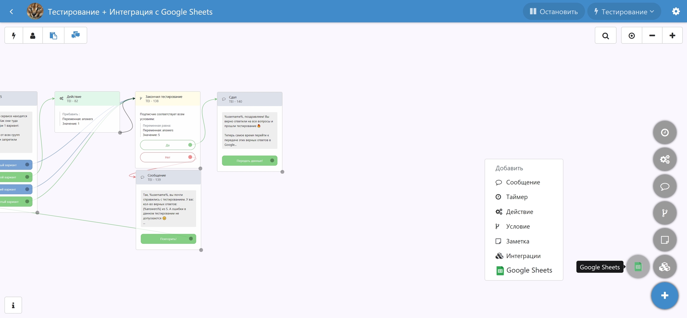 Создание интеграции доступно в чат-боте в виде отдельного шага. Чтобы его создать, необходимо нажать на значок в виде 3-х кубов, либо вызвать контекстное меню в любом месте поля нажатием на правую кнопку мыши, и выбрать Google Sheets.