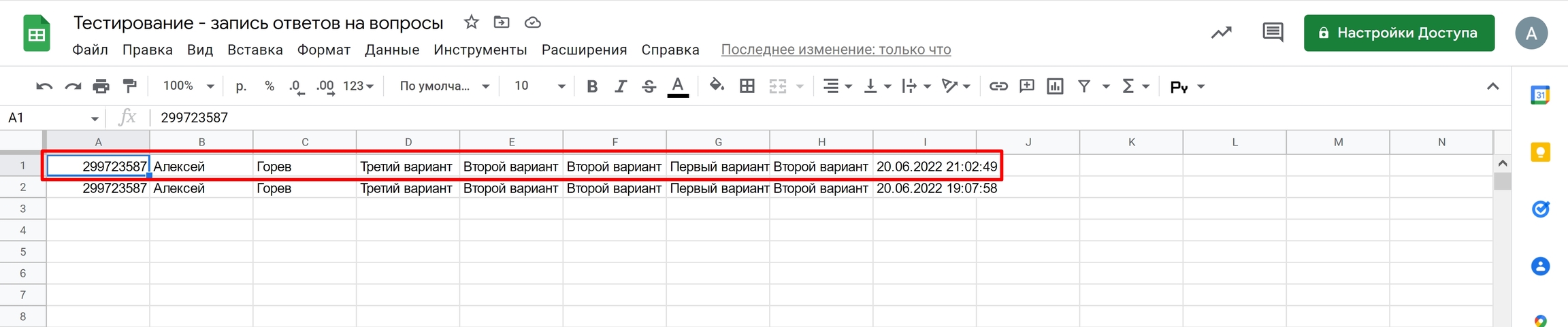 На скрине ниже как раз это продемонстрировано. В качестве столбца уникальности выбран столбец А. В нем есть совпадение по ID пользователя, поэтому строка была перезаписана, о чем свидетельствует поздние дата и время.