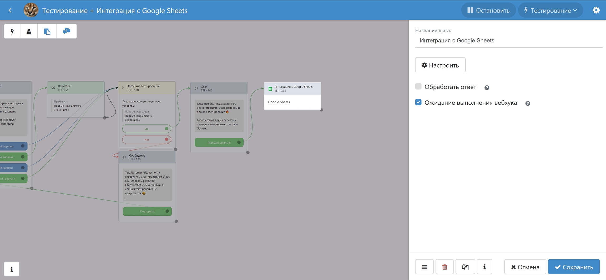 Ожидание выполнения вебхука - своего рода "проверка" того, верно ли настроена интеграция. Если при включенной опции после выполнения шага с интеграцией пользователь продолжает движение по чат-боту, то интеграция настроена верно. А при выключенной, наоборот, подписчик будет двигаться по боту дальше независимо от выполнения шага с интеграцией.